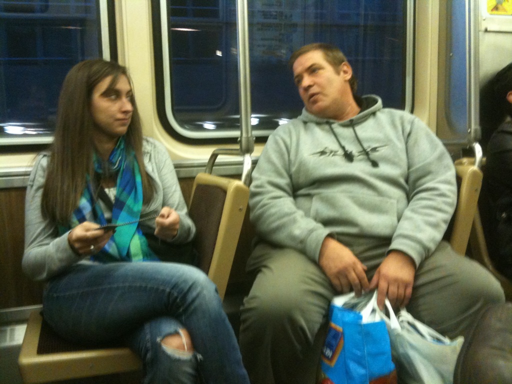 Compliments on the shuttle, as well as an awkward run in with the college kid (“Hey! There you are! Guess I was wrong! You didn’t even say good bye and I couldn’t find your shoes anywhere!”) led to pleasantries on the El. A man whom we’ll call “Crazy” pulled up a seat next to me with a “WOW! Day glo orange?!” I looked at him and said “Yes, that’s right.” He began telling me about a “place” that he had seen with lights that color coming through the windows but he didn’t trust what was going on inside.